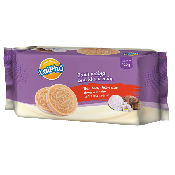 120G Lai Phu Taro Cookies is a combination of a crispy crust made from premium wheat and fat and creamy orange cream filling, giving you a new and exciting feeling when enjoying.